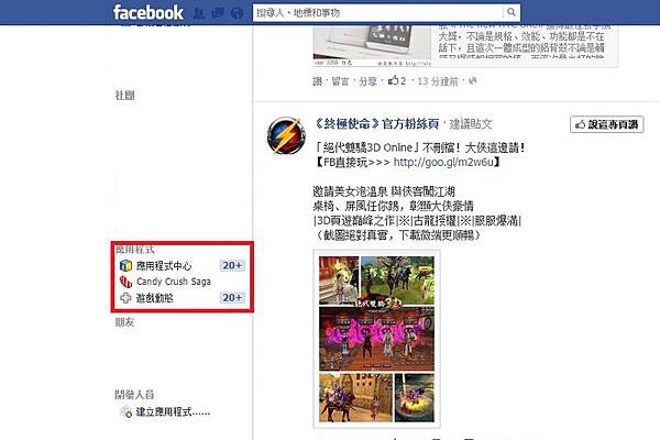 ▽臉書電腦版要怎麼進入Candy Crush遊戲?就在下圖左下角紅色框框(應用程式)的地方