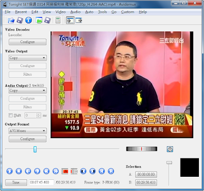 免費影片切割軟體–Avidemux支援輸入格式:AVI、DVD相容MPEG檔、MP4、ASF...等,用來切割影片相當方便,利用下拉選單設定切割起點【Edit】→【Set Maker A】、切割終點【Edit】→【Set Maker B】,左邊「Format」下拉選單是輸出的格式要選對(跟你輸入的格式一樣),再利用【File】→【Save】→【Save Video】將切割的片段另存新檔(自行輸入一樣的副檔名)。(阿榮)()(下載